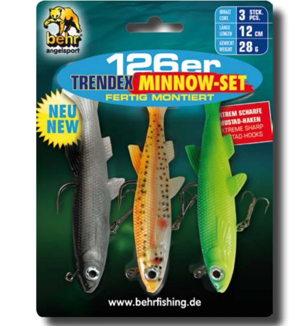Deze Behr Trendex minnow-set bestaat uit 3 shads met een gemonteerde jighead en een dreg aan de onderzijde. In iedere verpakking zitten 3 verschillende opvallende kleuren zodat er voor iedere situatie een goede kleur tussen zit! Deze shads hebben een zeer mooie afwerking en een mooie actie onder water die menig roofvis zal weten te strikken!
