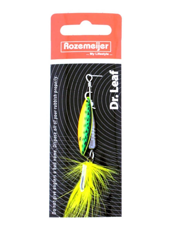 De Dr. Leaf spinner van Rozemeijer is voorzien van een zogenaamd Willow blad, een lang gerekt blad wat veel vibraties veroorzaak onderwater. Met een gewicht van 10g is deze spinner perfect aan een lichtere spinhengel en kun je met deze spinner op talloze wateren aan de slag. De spinner is afgewerkt met een scherpe dreg, verstopt onder een bosje veren voor extra attractie.